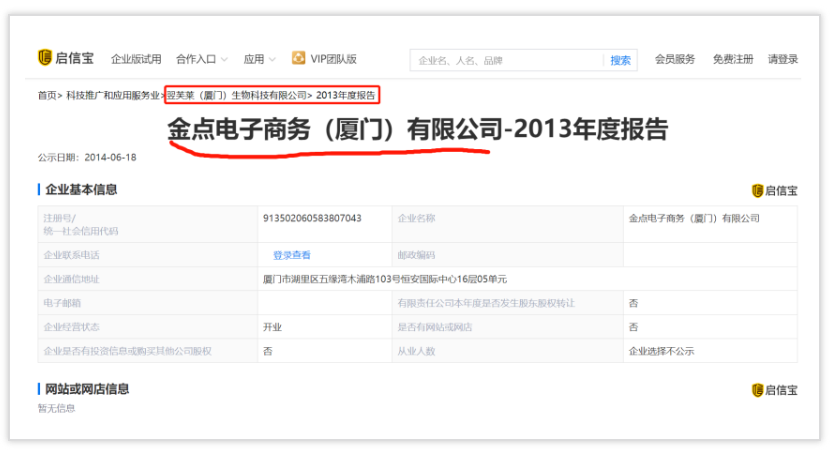 更可笑的是,在2014年的企業(yè)年報顯示,這家廈門翌芙萊的公司前生是一家叫做:金點電子商務(廈門)有限公司,可想而知做了兩年加盟商后就開始策劃走假冒品牌的路子。